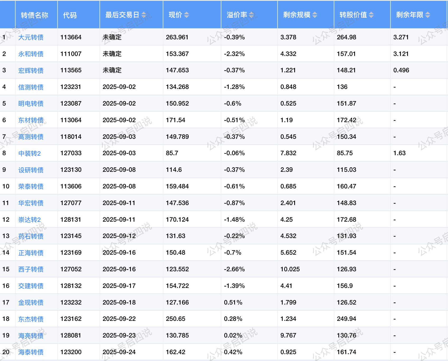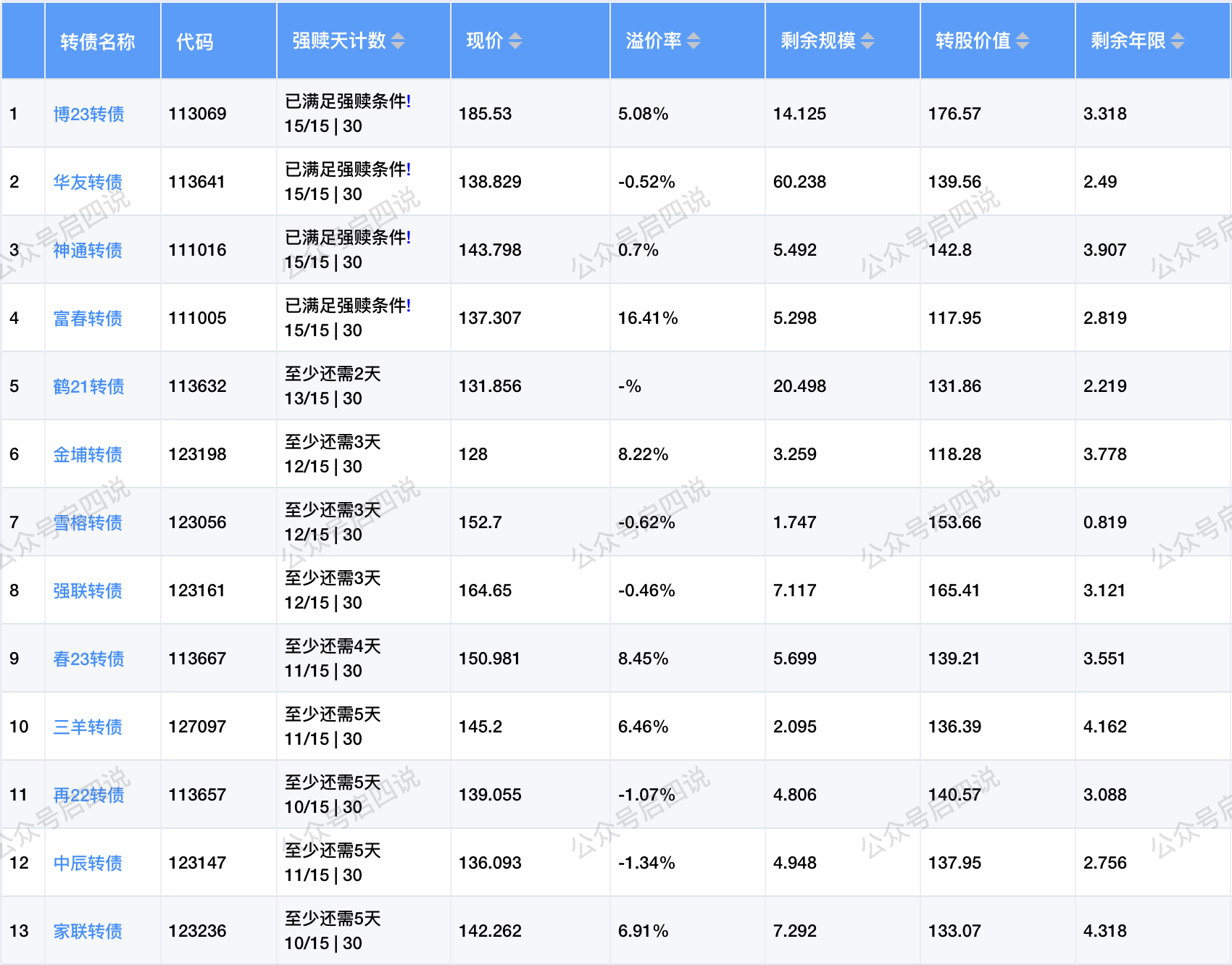 其中转股价值接近或大于130元,且规模大于5亿或溢价率大于3%的转债,需要注意强赎后杀溢价的风险。