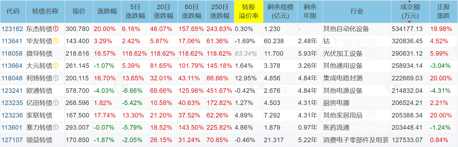 东杰智能(19.98%)、华海药业(10.01%)、苏州科达(10.04%)、利扬芯片(20.00%)、利扬转债(16.70%)、微导转债(16.57%)、东杰转债(20.00%)、家联转债(17.74%)