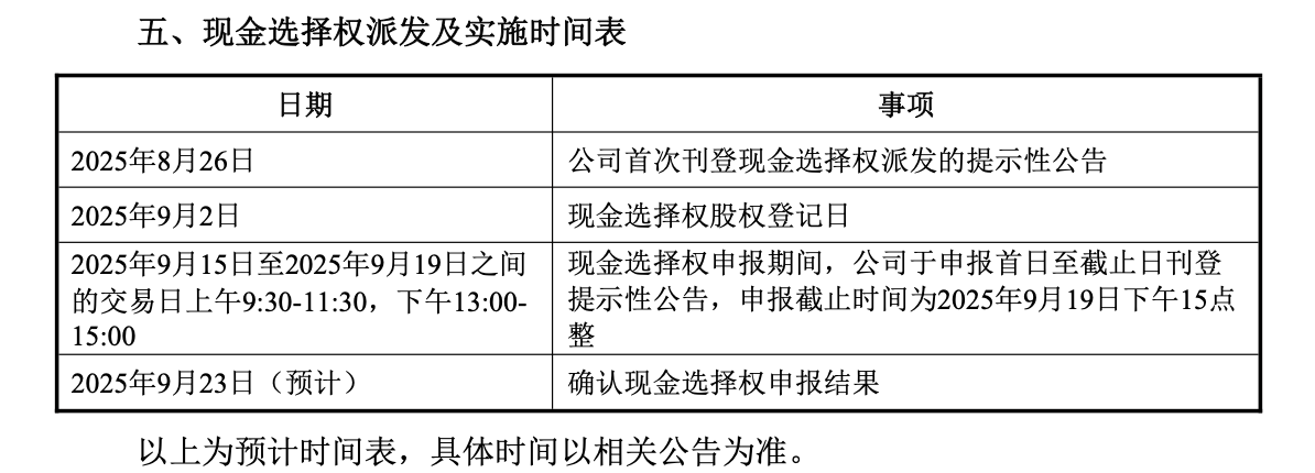 申报时间已经出来了,2025/09/15-2025/09-19开盘期间申报现金选择权,申报完等着领钱就好。