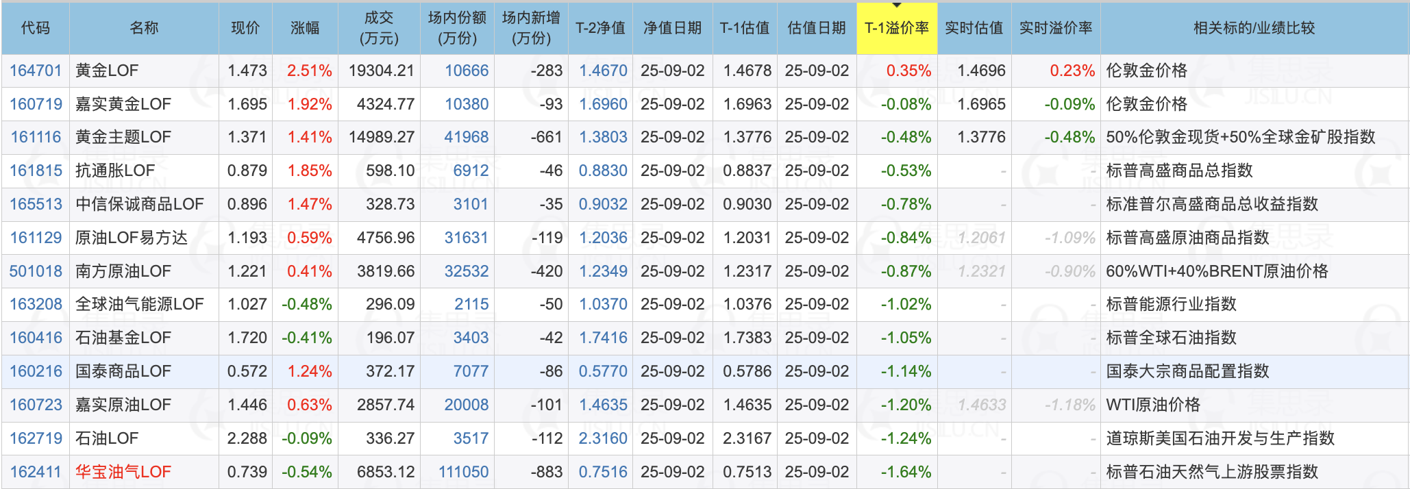 黄金 LOF,今天终于有点起色了。和其他商品类 LOF 比起来,它的溢价率收缩得更快,164701 甚至已经转成溢价。如果金价能延续上涨,再叠加降息预期,不排除会再来一波资金炒作。