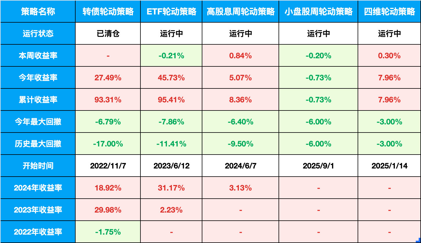 总仓位:92%(ETF轮动40%,小盘股策略30%,红利低波12%,黄金10%)