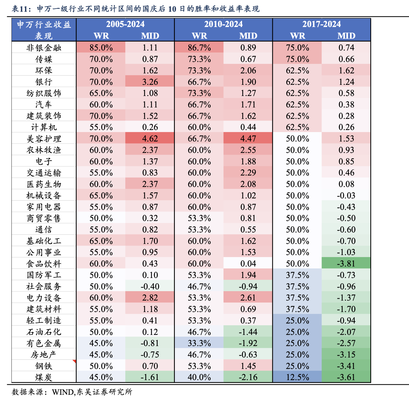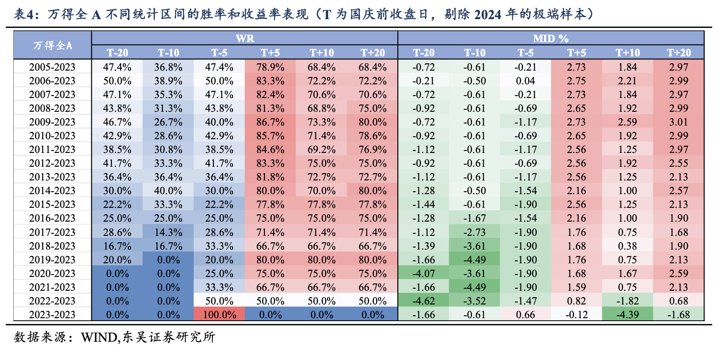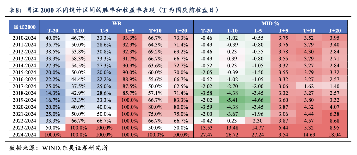 每年国庆前 10 天,大盘大概率是走得比较疲软,胜率甚至不到三分之一,很多人心态会有点慌。可一旦过了节,行情往往变得强势,特别是节后 5 天,胜率能到 80% 以上,拉升很快。换句话说,节前心情闷,节后容易嗨。