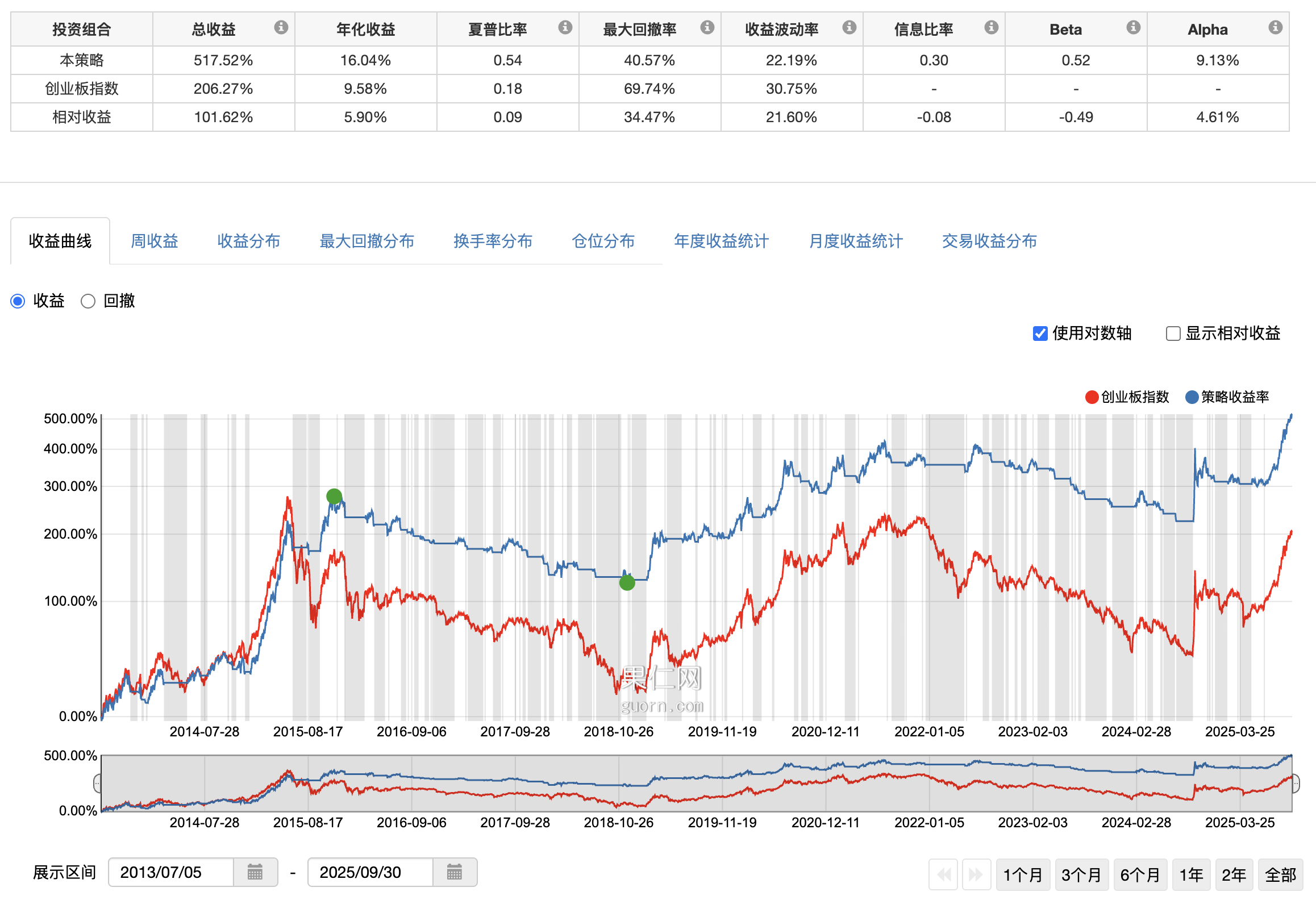 下面是创业板指数从2016/07/06-2025/09/30的回测数据,采用了均线系统后: