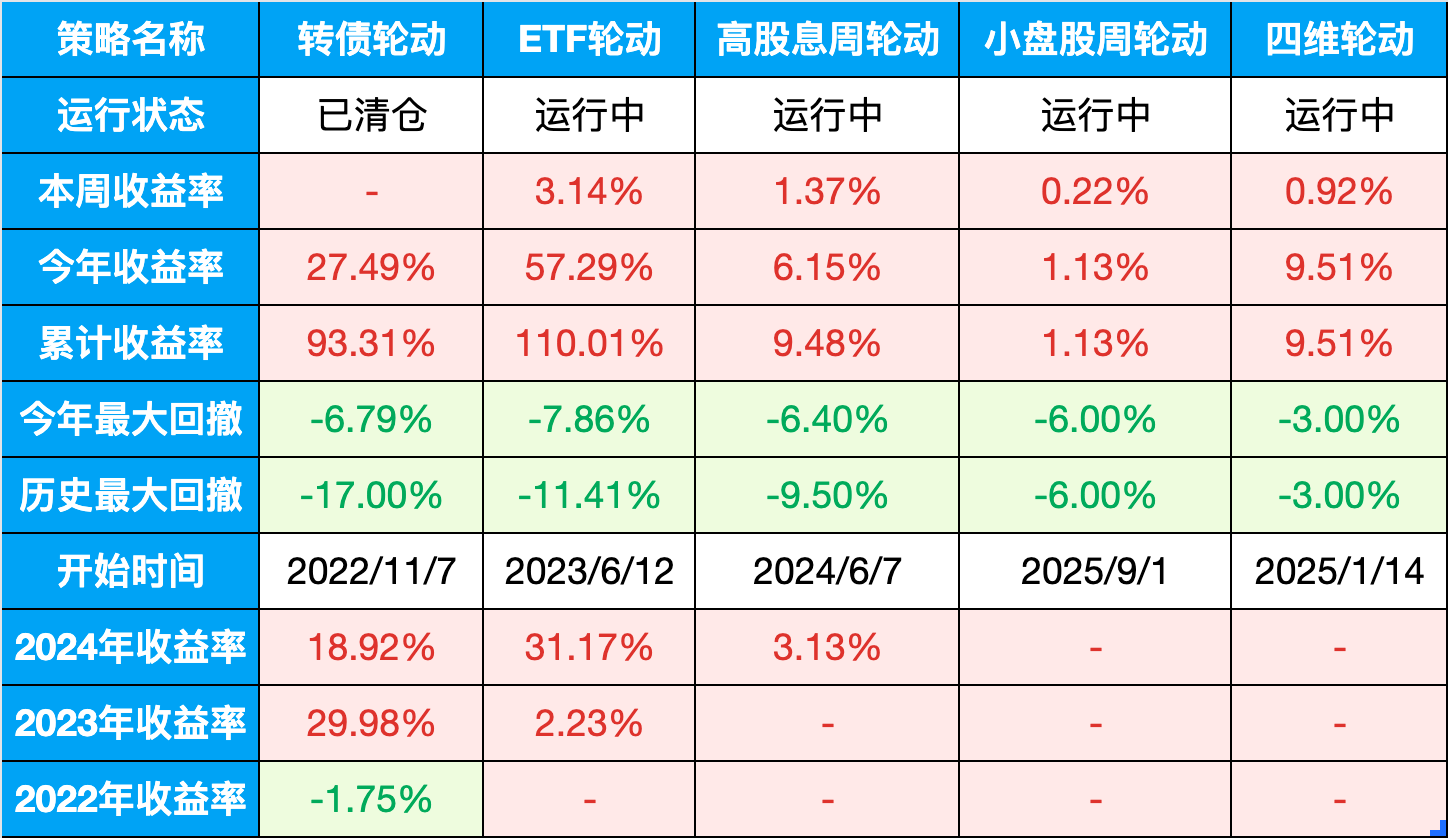 总仓位:85%(ETF轮动40%,小盘股策略30%,红利低波12%,黄金3%)