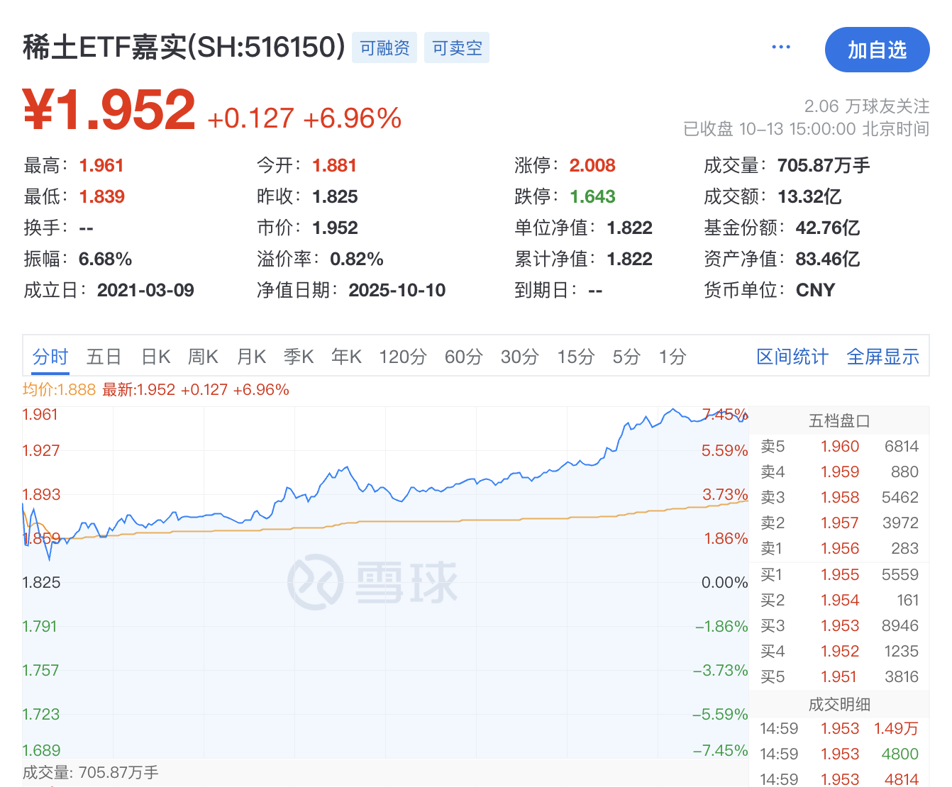 更稳的做法是看稀土产业链ETF。它覆盖北方稀土、中国稀土、广晟有色、金力永磁等核心龙头,等于押整条产业链,不用做选择题。