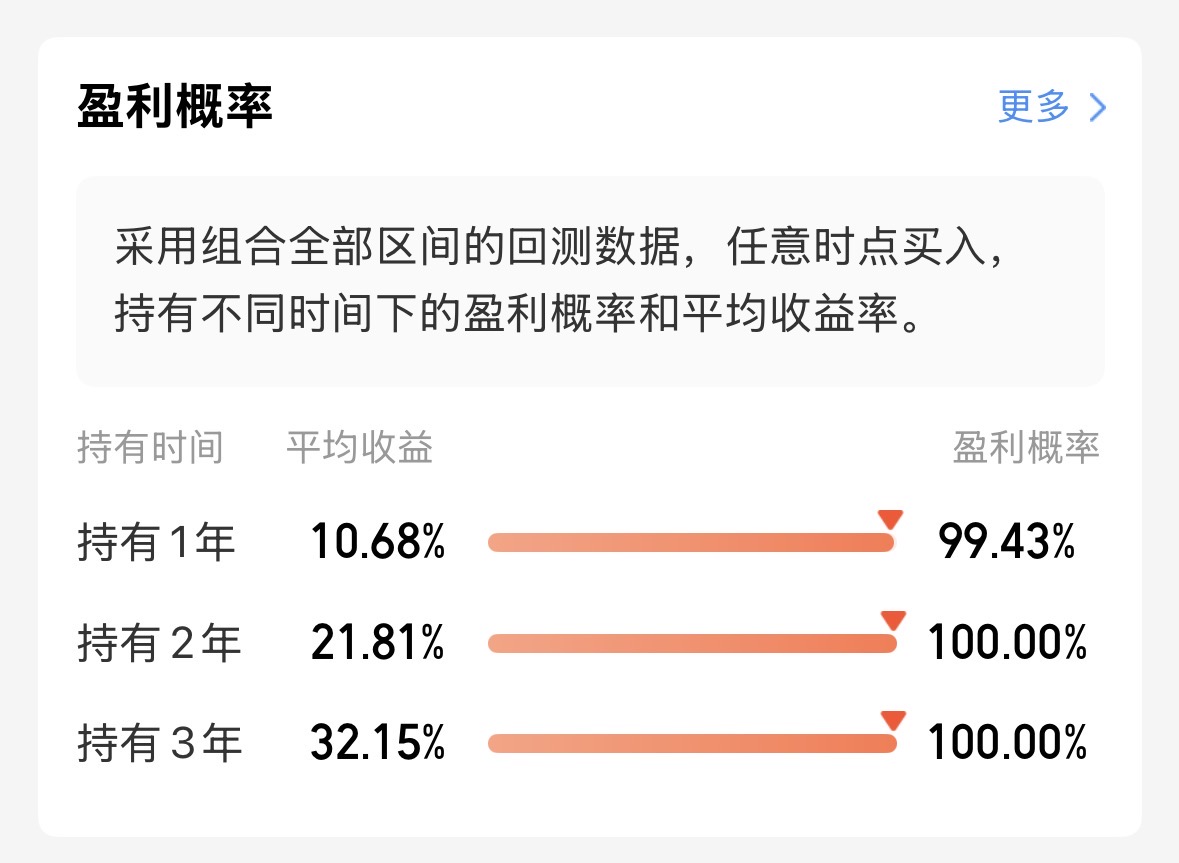 持有1年盈利概率99.34%,持有2年以上,盈利概率100%。