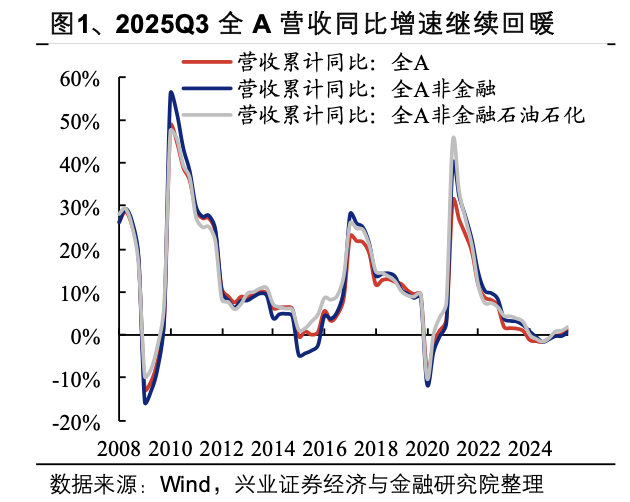 三季报整体还行,没爆发,但比上半年明显好。全A营收同比增长1.35%,净利润增长5.54%,分别比上半年提高1.23和2.95个百分点。企业盈利的底部基本确认,修复还在继续。