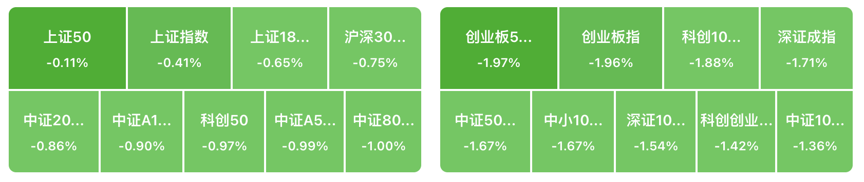 今天各大宽基全线收绿,权重护盘、成长退潮。银行、保险、旅游酒店这些红利板块逆势微涨,贵金属、汽车、光伏设备跌幅居前。