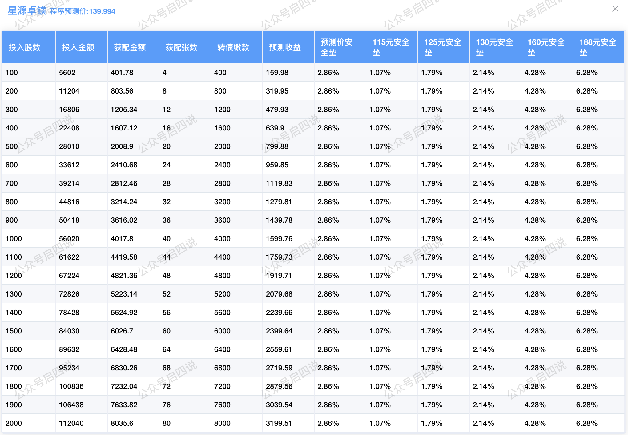 程序预测上市价139.994元,启四预测上市价有望冲击200+,配债所需股数和安全垫可以参考下图: