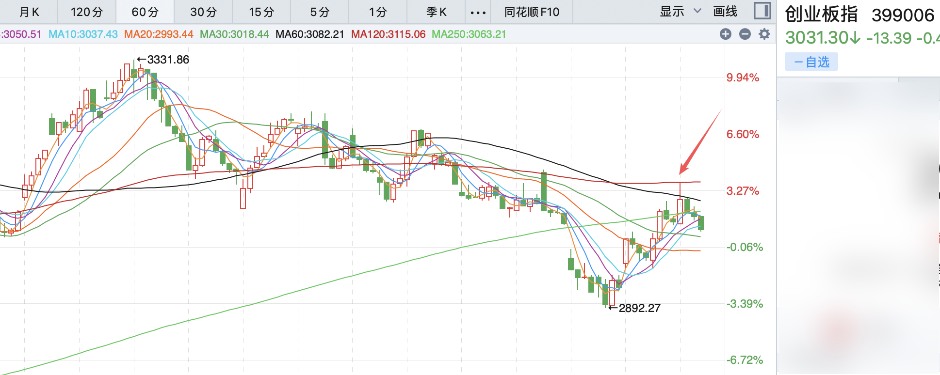 量能不够,市场就依然是调整状态,今天的创业板就很明显,早盘冲高后没多久就一路回落。