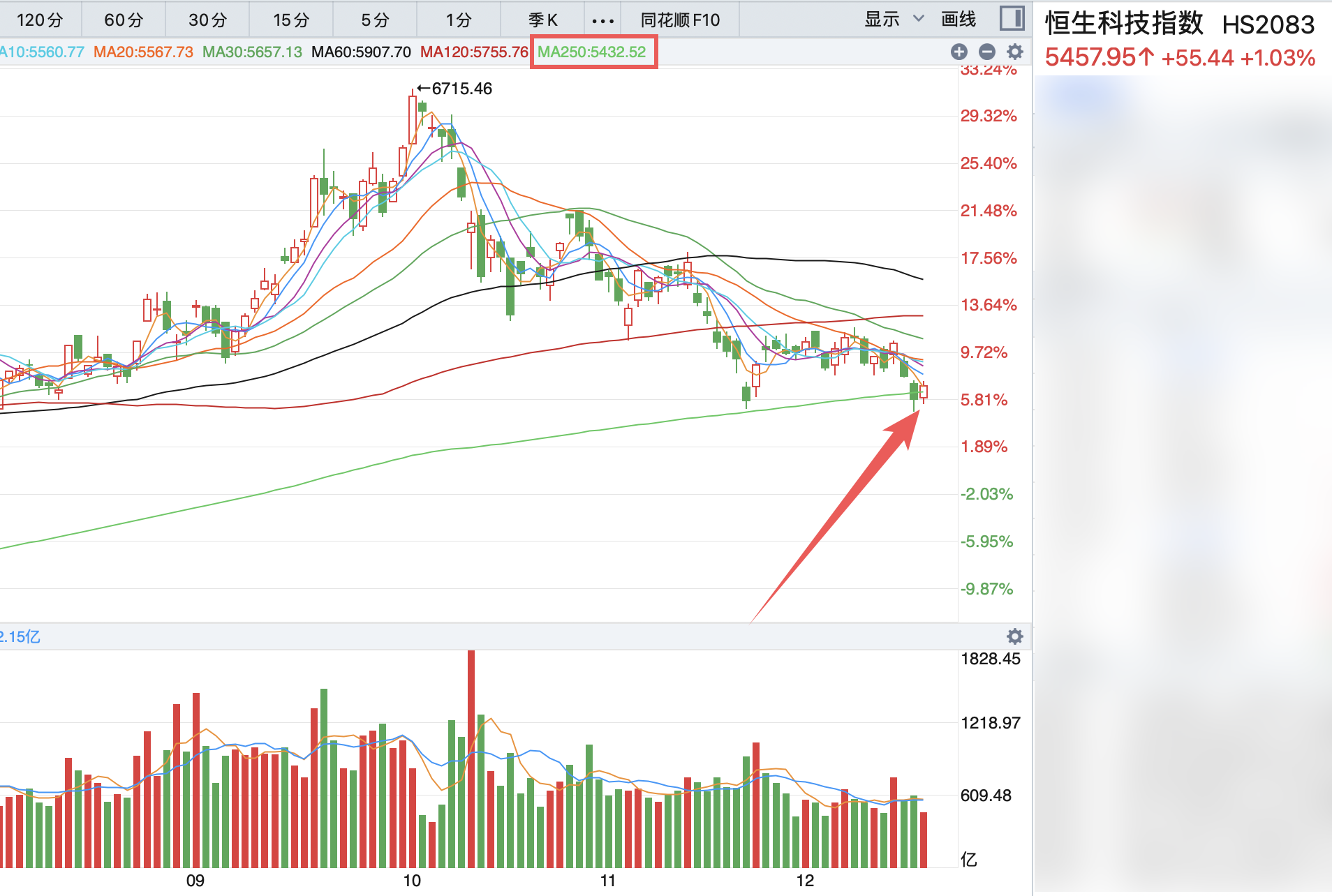 2、再说恒生科技,昨天刚跌破年线,今天又被拉了回来,现在就在年线附近反复拉锯。这个位置不是趋势已经走坏,而是多空分歧最大的地方。