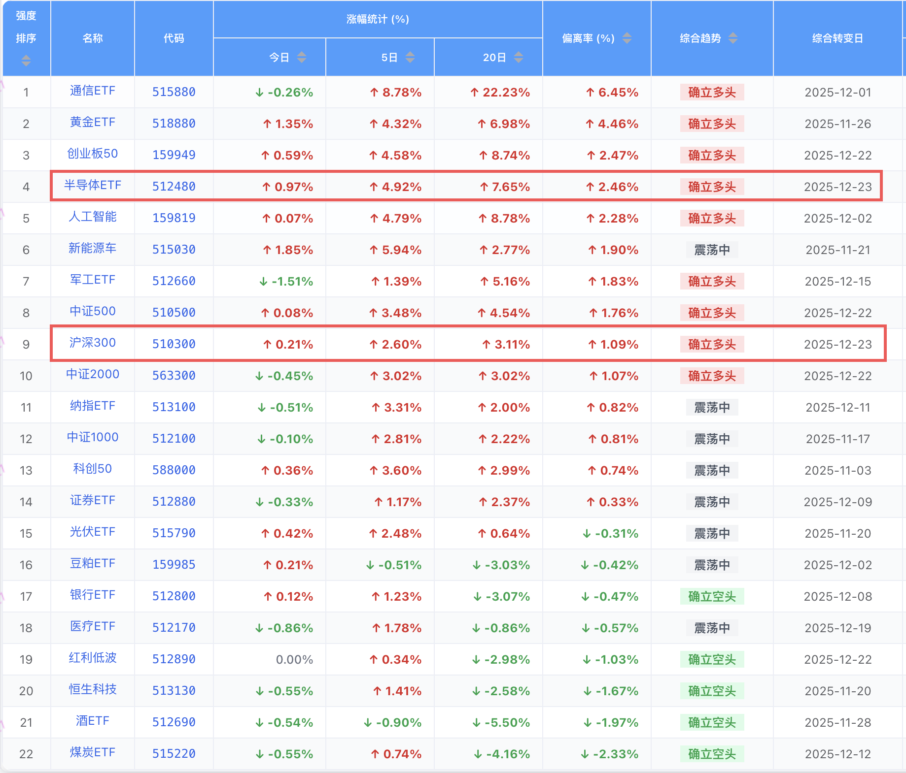 2只ETF趋势发生了转变,确立多头增加2只。