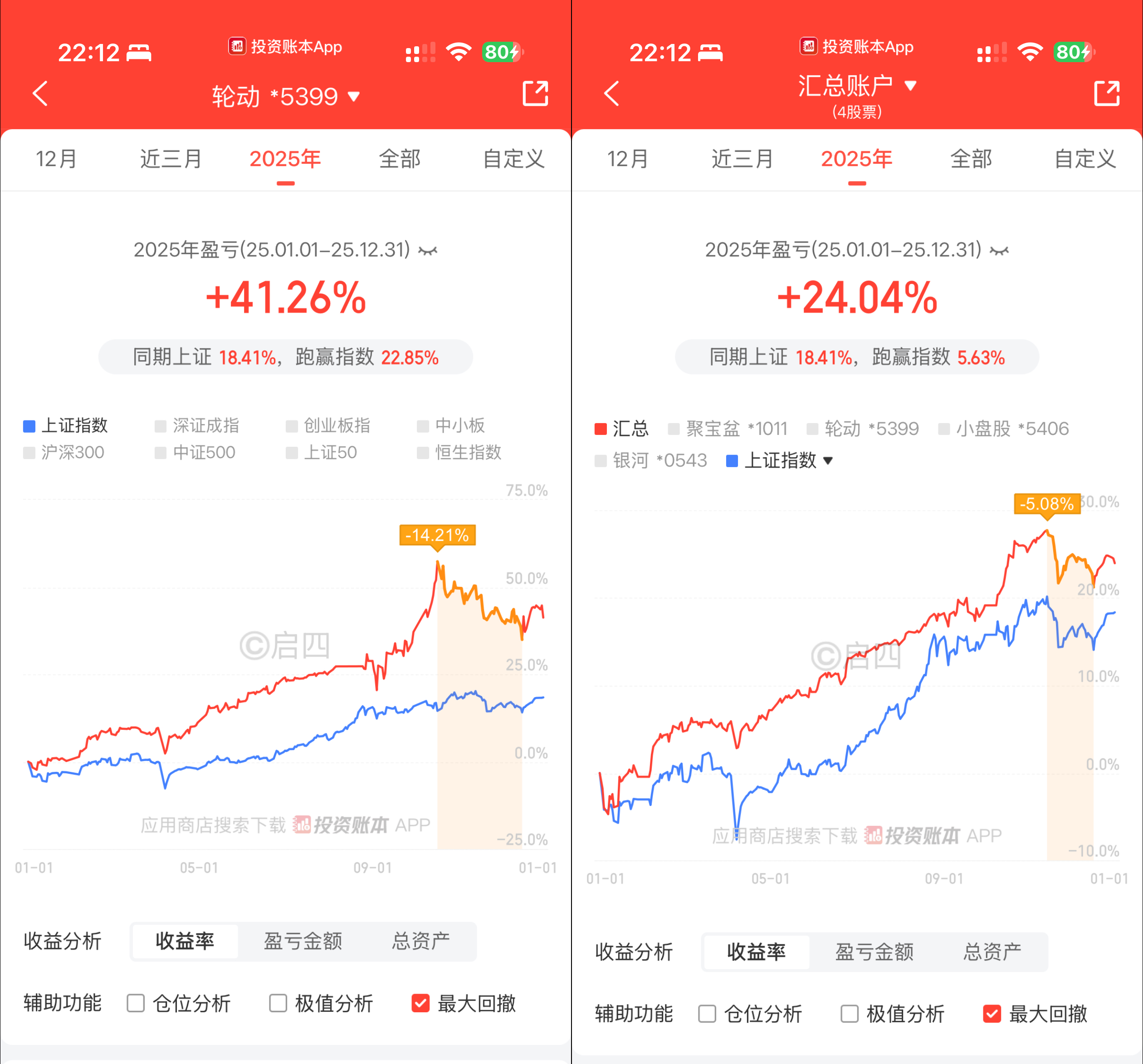 托市场的福,今年两个账户表现都更好,不过和去年相同的是,这是主观没能跑赢量化的又一年。
