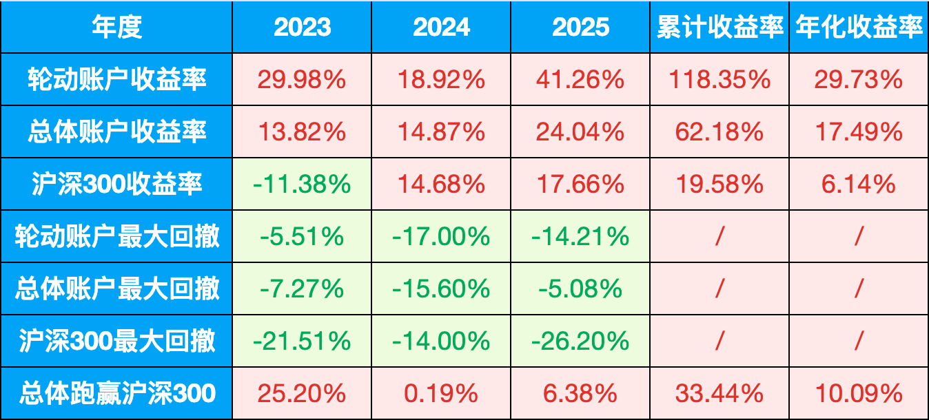 2024-2025年:我逐渐完成了系统化转型。慢慢从主观摊大饼,转移到了靠量化策略盈利,轮动账户实现三年翻倍,也证明了“规则”战胜“直觉”的威力。