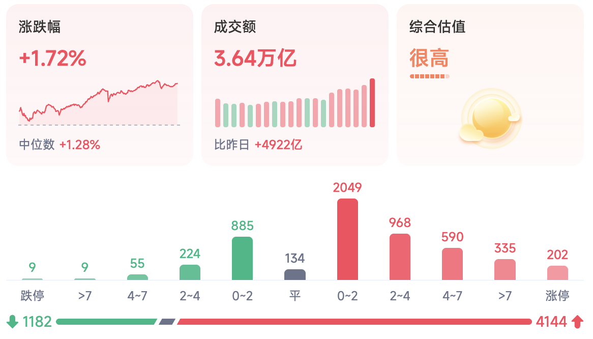 **成交天量:**两市成交额高达3.64万亿元,刷新了2024年10月8日创下的历史纪录,说明增量资金正在大举入场。