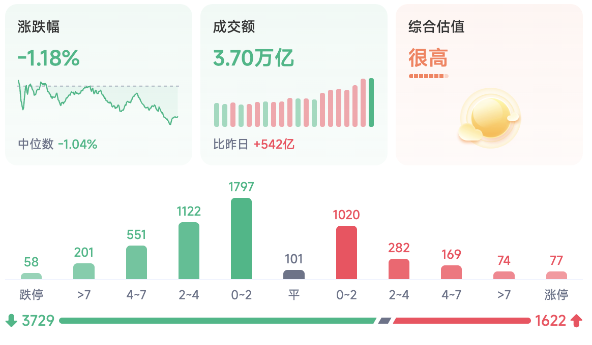 1、大跌终于来了,17连阳被终结,但这不重要,最吓人的是成交额——3.7万亿元!昨天3.64万亿我们才说是历史巅峰,今天居然又小幅放量,再次刷新纪录。