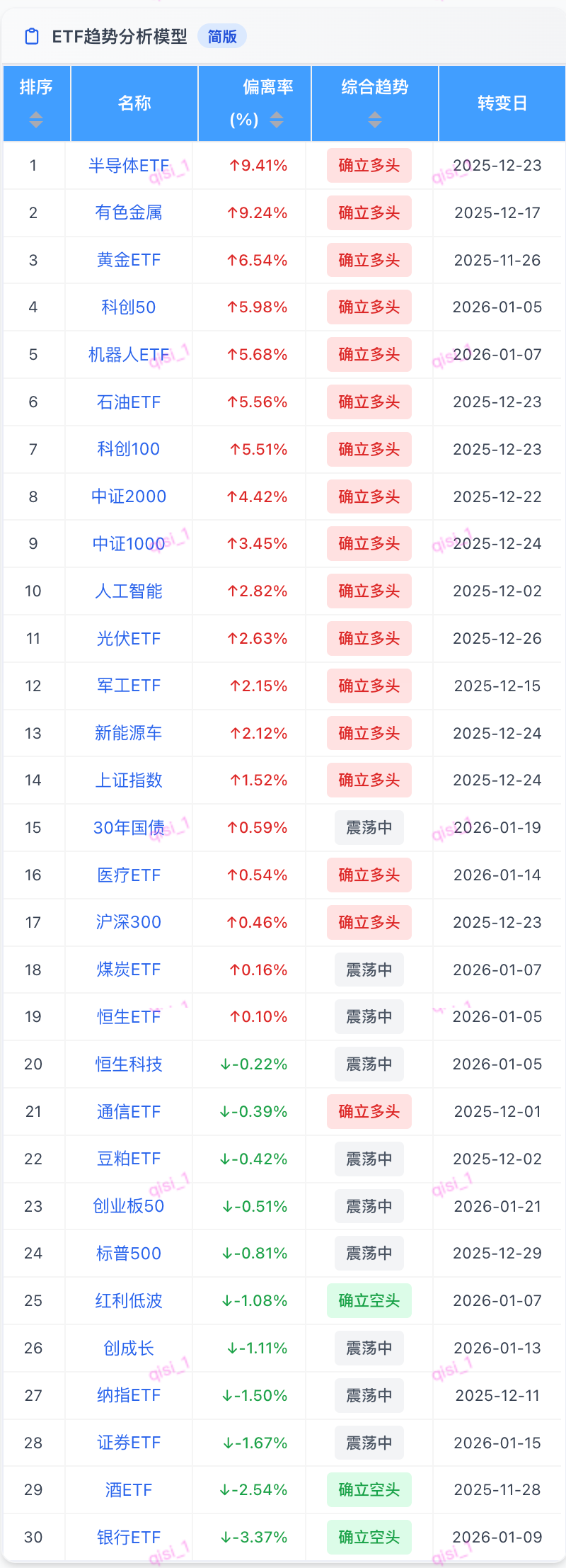 最强势资产:半导体ETF、有色金属、黄金ETF
