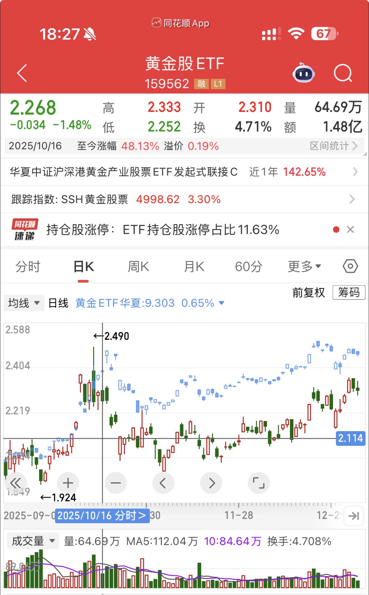 我的经验是,在自选池里同时挂上黄金ETF华夏(518850)和黄金股ETF(159562),用它们的量价走势对比,就能清晰观察资金情绪,比单纯看单边涨跌、猜顶抄底靠谱多了。