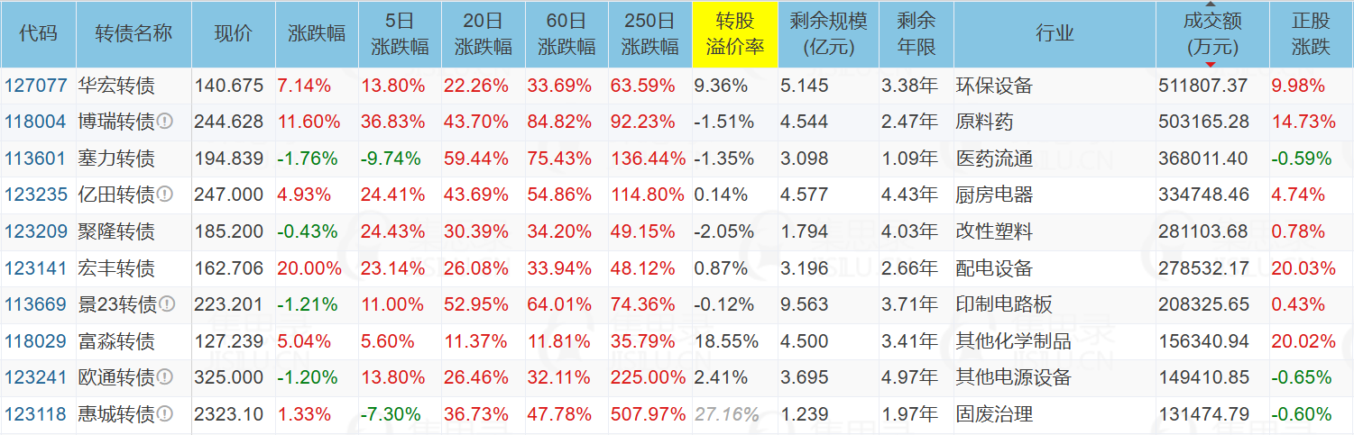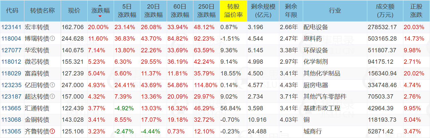 华宏科技(9.98%)、温州宏丰(20.03%)、塞力医疗(-0.59%)、富淼科技(20.02%)、宏丰转债(20.00%)